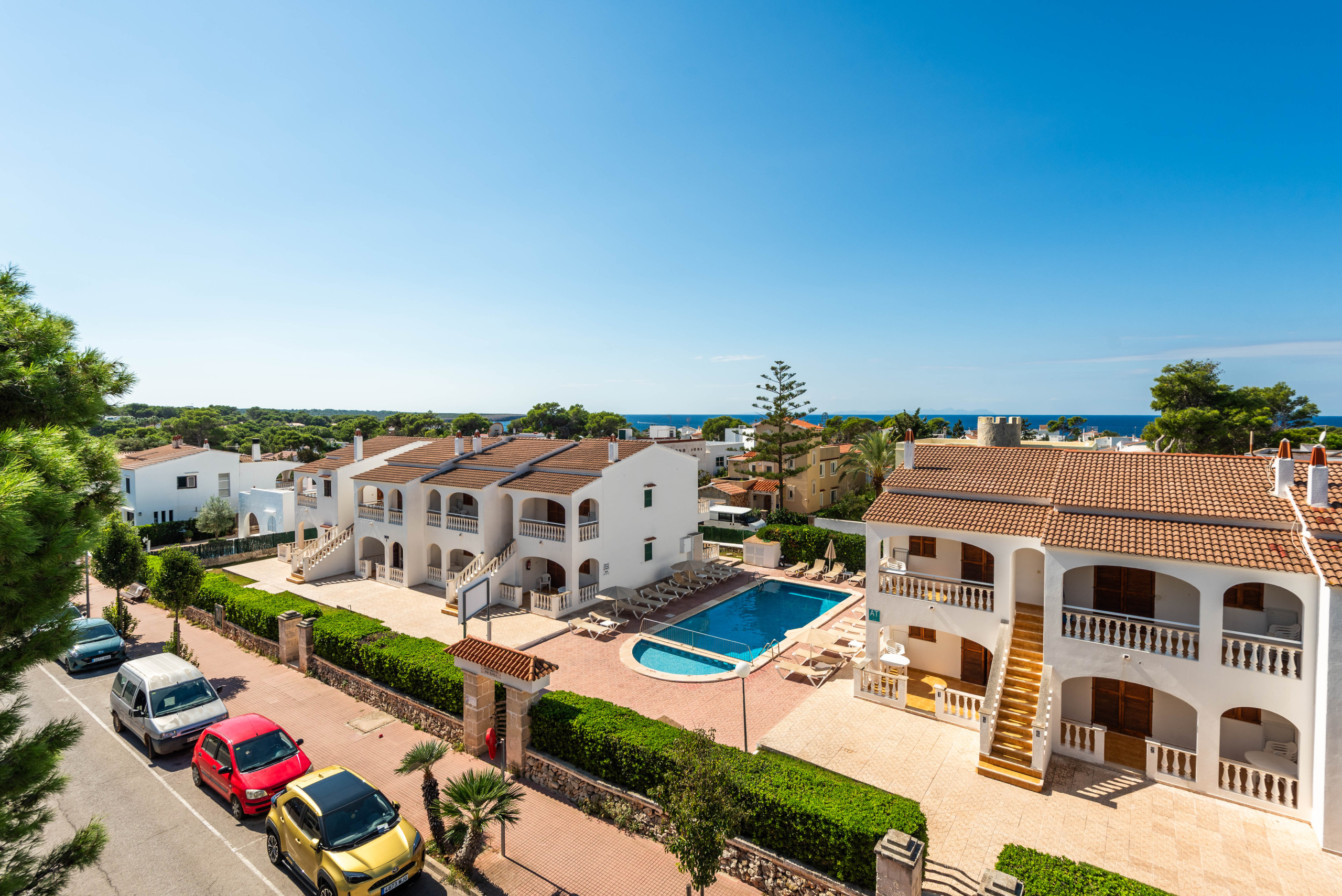 El complejo ofrece una piscina comunitaria con zona de poca profundidad para niños, perfecta para disfrutar del sol menorquín con tranquilidad.